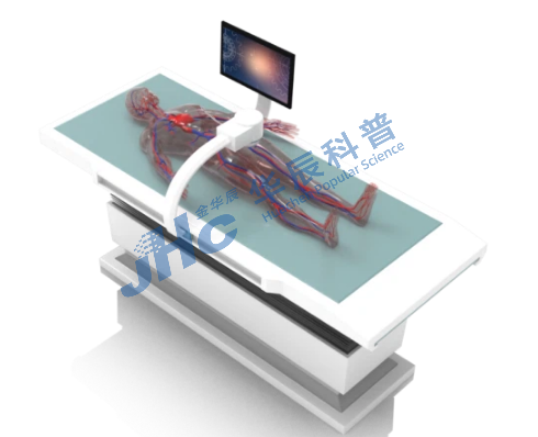 展品由血管介入机器人、手术台、人体模型、工控机、音箱、触摸显示器等组成。体验者可以通过触控和滑动探测头组件控制和观察血管介入机器人在人体中的工作场景,以人体实物模型作为模拟对象,模拟血管介入机器人的使用场景,了解血管介入机器人的知识。