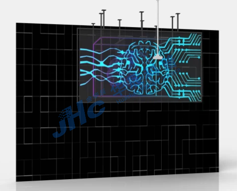 通过运用多层透明亚克力雕刻展示出立体的大脑轮廓,外层光子成像膜配合激光投影呈现大脑左右两边的特效演绎,运用此互动方式展示人工智能与人类智能的复制和学习。