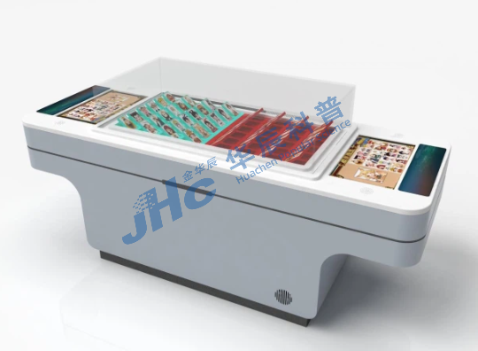 展项由模型组台、触控屏、机械装置组成。串口控制模块、UI模块、网络通讯实现交互控制,模型台上分为蓝方与红方,屏幕设置20个角色,双方各自选好角色,开始提问,其中一方提问、另一方屏幕上会显示是或否按钮,根据对方给到的答案,点击屏幕筛选掉“否”的角色,被点击的角色则会通过串口指令控制桌面上对应的机械牌关闭,多轮回合后,最后看谁最先猜测到对方玩家选中的角色。