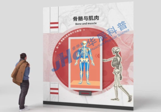 展项由多媒体屏幕、感应装置、计算机等组成。展墙内嵌液晶电视,外覆钢化玻璃,前部安装体感识别系统。体验者站立于指定位置后,通过显示器内容学习骨骼与肌肉的位置,功能和介绍。