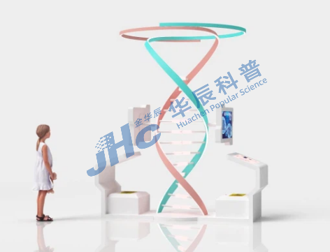 展项设置一个DNA双螺旋结构模型,两侧放置一体机触摸屏,屏幕内有一组碱基序列ATGC模型即腺嘌呤、胸腺嘧啶、鸟嘌呤和胞嘧啶,体验者可根据基因组配对原则选择合适的碱基模块搭建出完整的DNA螺旋模型,搭建正确后台面上方播放视频了解DNA的双螺旋结构、血型、显性和隐性、性别等基因与遗传特征方面的内容。