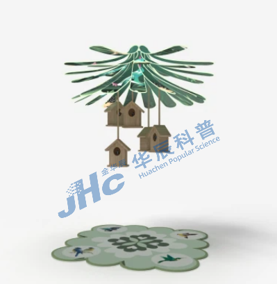 展项主要由墙面大树造型、鸟窝组件、图文板、触发组件等部分组成。顶部有错落分布的鸟窝,当参与者脚踩地面对应的鸟类的图案时,会触发相应的鸟窝门开启,小鸟模型伸出鸟窝,发出该种鸟儿的叫声。鸟类以兴安盟特有鸟类为主。