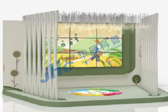 展项由地面24节气图文名称、多媒体大屏幕(利用展厅墙面原有屏幕)、感应系统组成。观众脚踩对应的节气名称,大屏幕上则播放对应节气科普视频。