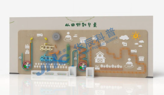 粮食从田野到餐桌的过程涉及多个环节,包括种植、收获、加工、运输、销售等。本展项沿墙面以小球为载体,设置一套传递路径,让小球在运行过程中,经过各个机构模块,完成粮食从田野种植、收获、加工、运输、超市销售的不同故事情景。观众观看小球在各种机械传动机构中完成了连续输送运转,了解生活中的机械结构,体味机械工具中蕴藏的智慧。