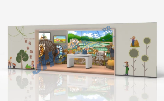 8块小屏幕从左往右依次播放的内容依次是:播种萌芽-移栽-生长抽穗-成熟-收割-加工-做成食物介绍营养价值等,中间大屏幕介绍水稻的发展史、分布、主要价值、以及我国在水稻方面的成就。台面上有9个识别卡片,分别代表9块屏幕的内容,观众选择想了解的内容的卡片放进凹槽中,系统会进行识别并控制对应的屏幕播放对应的内容。