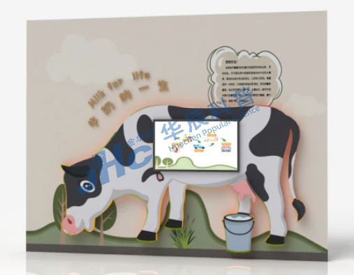 展项由立体浮雕展板、互动装置、多媒体屏幕组成。了解牛奶从牧场到商场的一系列流程,包括挤奶过程、牛奶加工、牛奶储藏、奶制品分类,观众还可通过多媒体互动,了解牛奶相关知识。