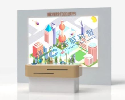展项由展台、触摸屏、显示屏幕(利用展厅墙面原有屏幕)等组成。观众在触摸屏上点击代表居民楼、医院、工厂、学校的元素,在屏幕中选择建设位置,屏幕中显示该建筑设施建设的过程,最后系统根据科学规划城市的评判标准在屏幕中显示相应反馈。